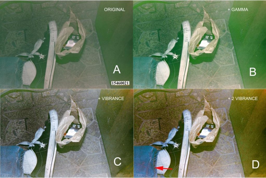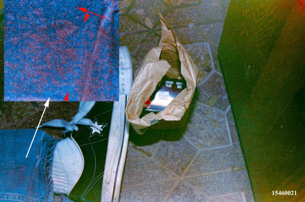 Adicionalmente, foram identificadas manchas com características de transferência (transfer stains), sugerindo contato posterior com superfícies ensanguentadas.