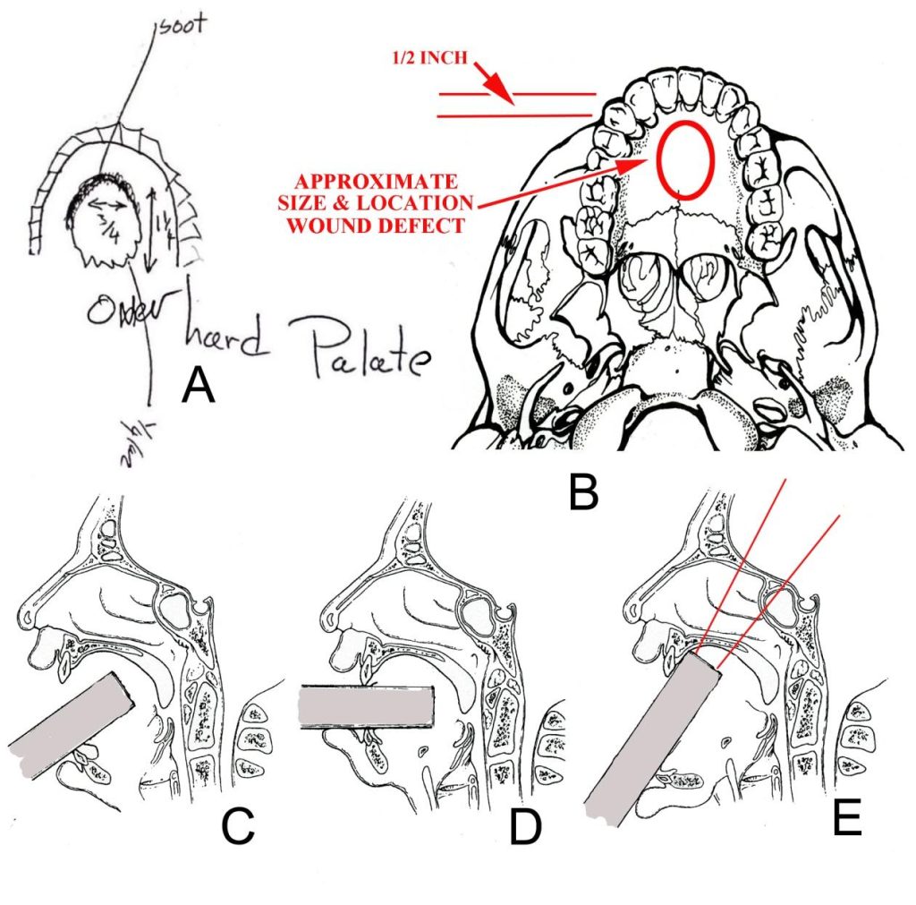 O relatório de autópsia descreve ferida de entrada no palato duro superior, com trajetória aproximada de 35° em relação ao eixo corporal.